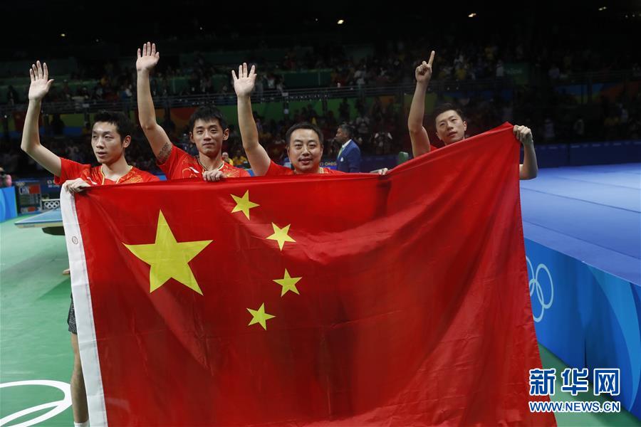 8月17日,中国队庆祝胜利。 当日,在2016年里约奥运会乒乓球男子团体赛决赛中,中国队以3比1战胜日本队夺得金牌。 新华社记者沈伯韩 摄
