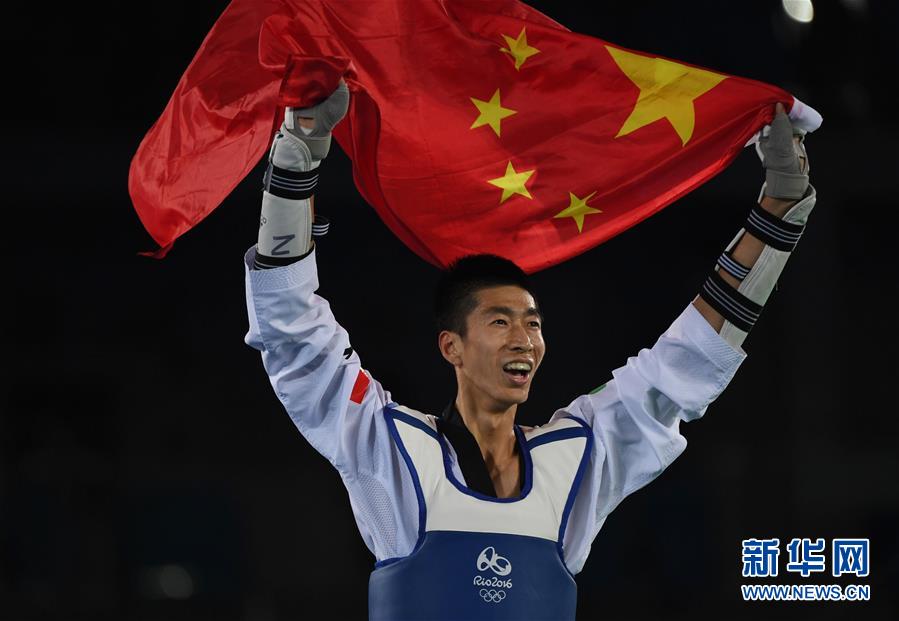8月17日,赵帅庆祝夺冠。当日,在2016年里约奥运会跆拳道男子58公斤级决赛中,中国选手赵帅战胜泰国选手,夺得冠军。新华社记者韩瑜庆摄