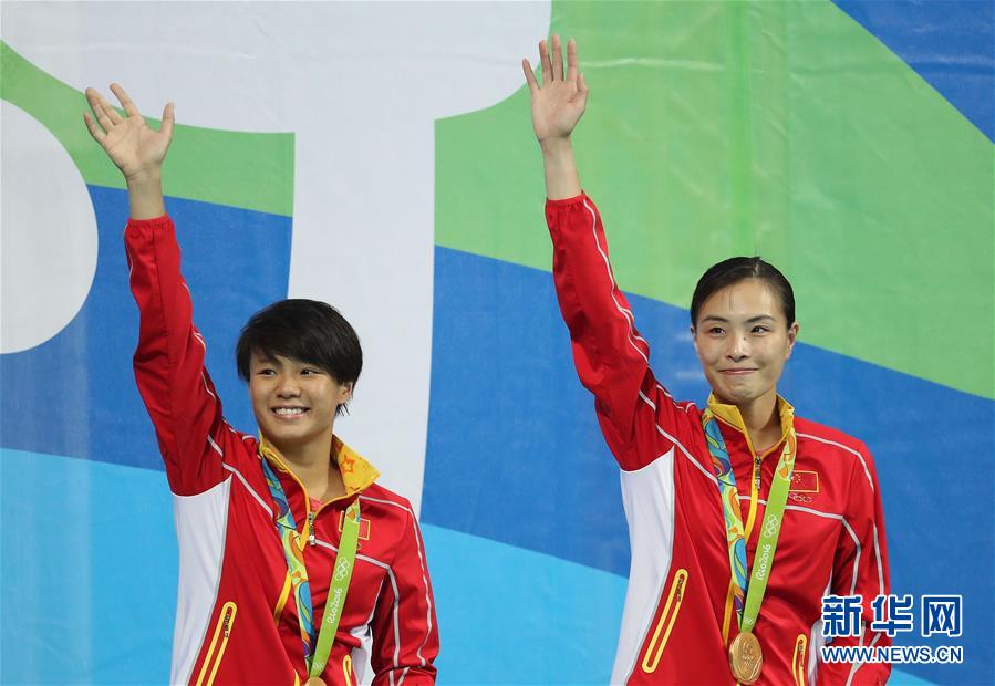 8月7日,吴敏霞(右)和施廷懋在颁奖仪式上。当日,在2016年里约奥运会女子双人三米板决赛中,中国选手吴敏霞和施廷懋以345.60分的总成绩夺得冠军。新华社记者曹灿摄