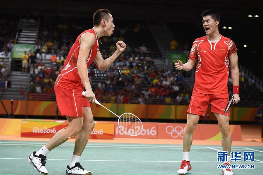 8月19日,张楠/傅海峰(右)在比赛中庆祝得分。当日,在2016年里约奥运会羽毛球男子双打决赛中,中国选手张楠/傅海峰以2比1战胜马来西亚选手吴蔚昇/陈蔚强,获得冠军。新华社记者王鹏摄