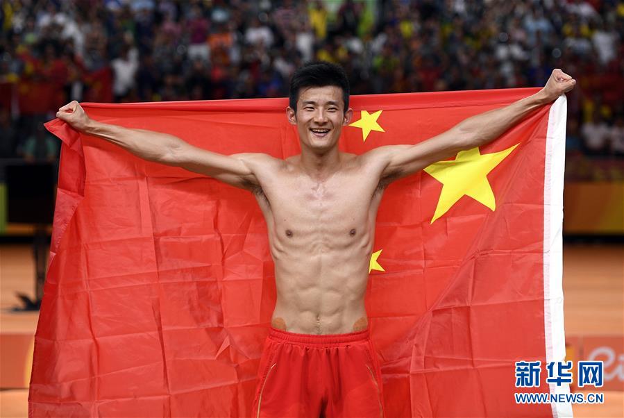 8月20日,谌龙在比赛后庆祝夺冠。当日,在2016年里约奥运会羽毛球男子单打决赛中,中国选手谌龙以2比0战胜马来西亚选手李宗伟,夺得冠军。新华社记者王鹏摄