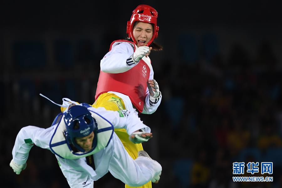 8月20日,中国选手郑姝音(上)和墨西哥选手埃斯皮诺萨在比赛中。当日,在2016年里约奥运会跆拳道女子67公斤以上级决赛中,中国选手郑姝音战胜墨西哥选手埃斯皮诺萨,获得金牌。新华社记者王毓国摄