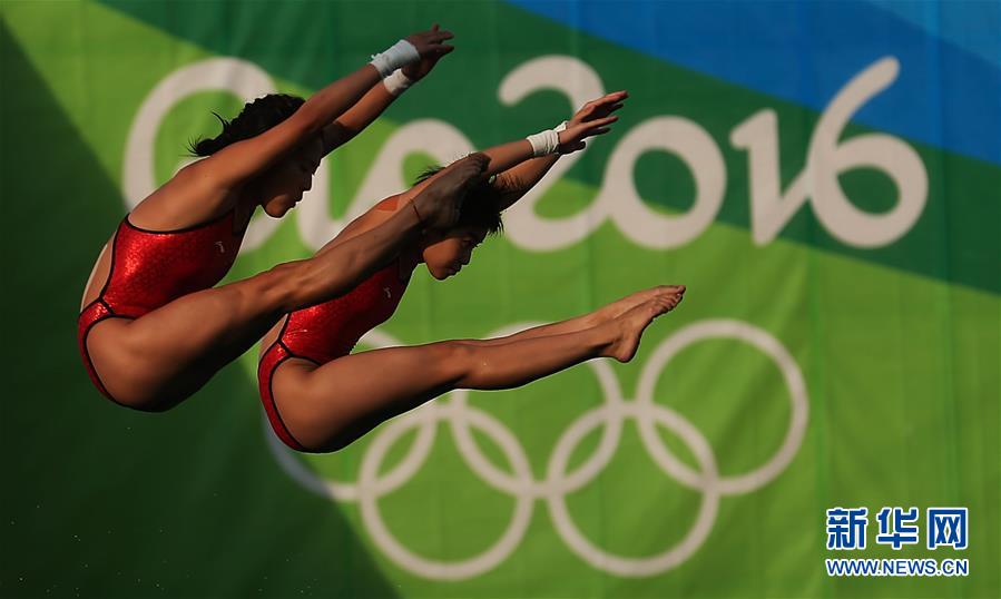 8月9日,中国选手陈若琳(左)/刘蕙瑕在决赛中。当日,在2016里约奥运会跳水女子双人十米台决赛中,中国组合陈若琳/刘蕙瑕以354.00分夺冠。新华社记者曹灿摄