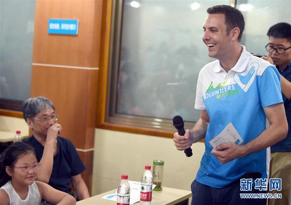 来自浙江大学的志愿者、澳大利亚留学生提姆在杭州东山弄社区教居民学英语(8月2日摄)。