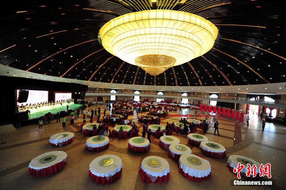 该蒙古包直径60.7米,穹顶高21.3米,檐口高度7.3米,总覆盖面积3180平方米,被世界吉尼斯总部评为“世界最大蒙古包”。图为婚礼现场。中新社记者 翟羽佳 摄