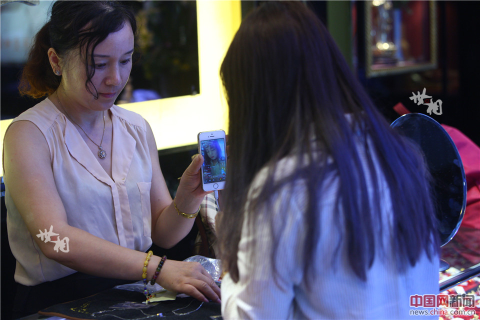 妈妈给张丽洁拿着手机来直播展示饰品佩戴效果。做珠宝生意的妈妈并不希望女儿干代购,觉得女儿太累了,能帮自己打理珠宝店更好。