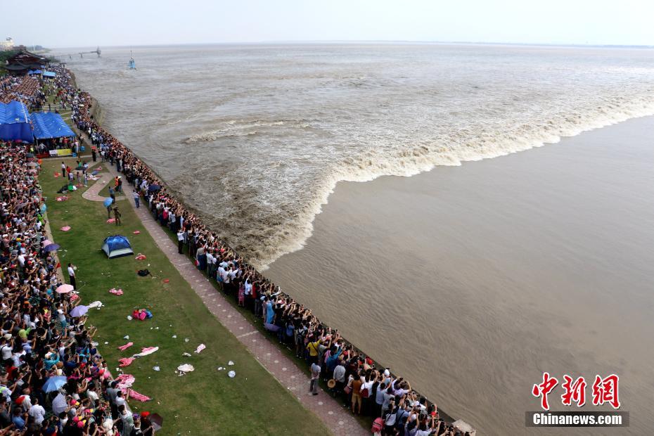 9月18日,浙江省海宁市盐官镇的观潮点吸引了众多游客。当天,被誉为“天下第一潮”的浙江海宁一线潮奔腾而来,吸引了十多万人前来观潮。中新社记者 何蒋勇 摄