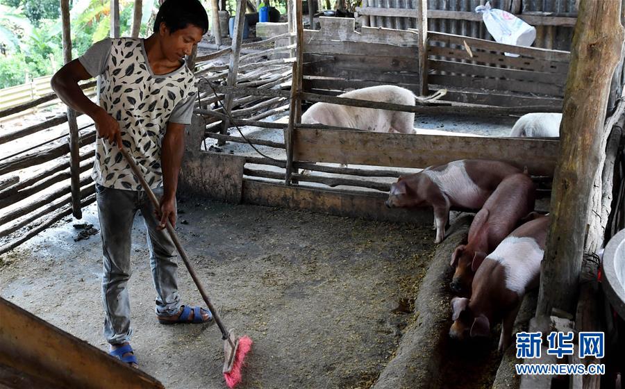 云南省普洱市西盟佤族自治县勐梭镇秧洛村博航八组村民岩嘎在自家的猪圈内打扫卫生(9月22日摄)。新华社记者 蔺以光 摄
