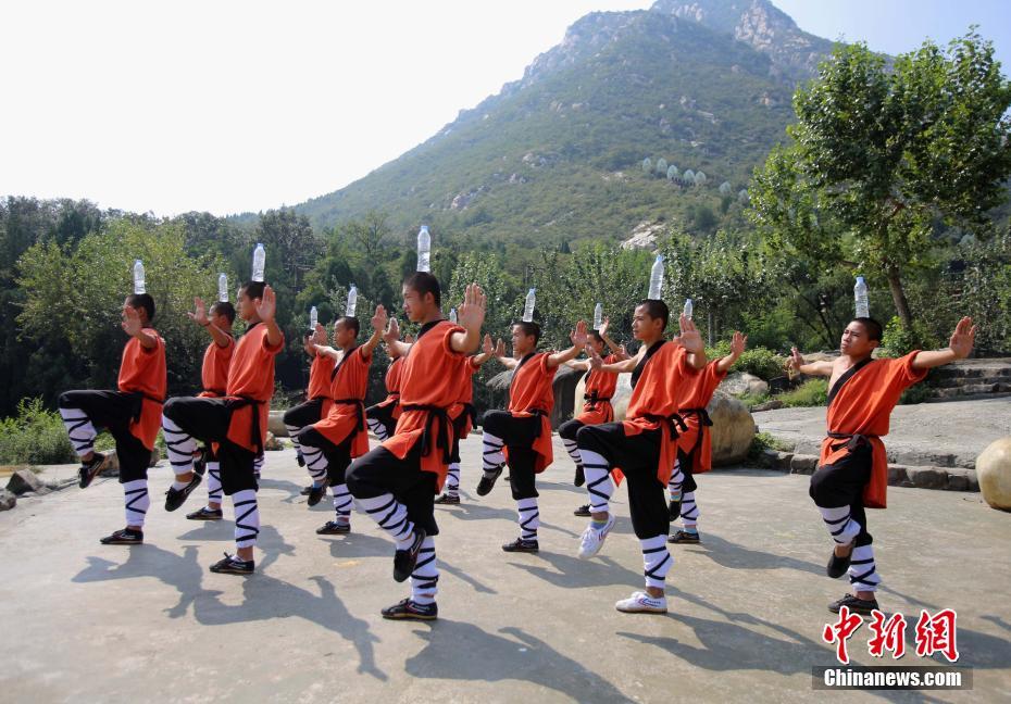 9月29日,河南登封嵩山脚下禅宗少林演武广场,一群少林武僧头顶矿泉水瓶金鸡独立、扎马步,苦练基本功。据了解,每逢国庆长假,都会有大量中外游客涌向少林武术发源地河南登封旅游。王中举摄