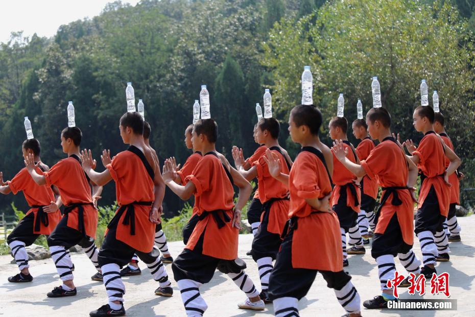 9月29日,河南登封嵩山脚下禅宗少林演武广场,一群少林武僧头顶矿泉水瓶金鸡独立、扎马步,苦练基本功。据了解,每逢国庆长假,都会有大量中外游客涌向少林武术发源地河南登封旅游。王中举摄