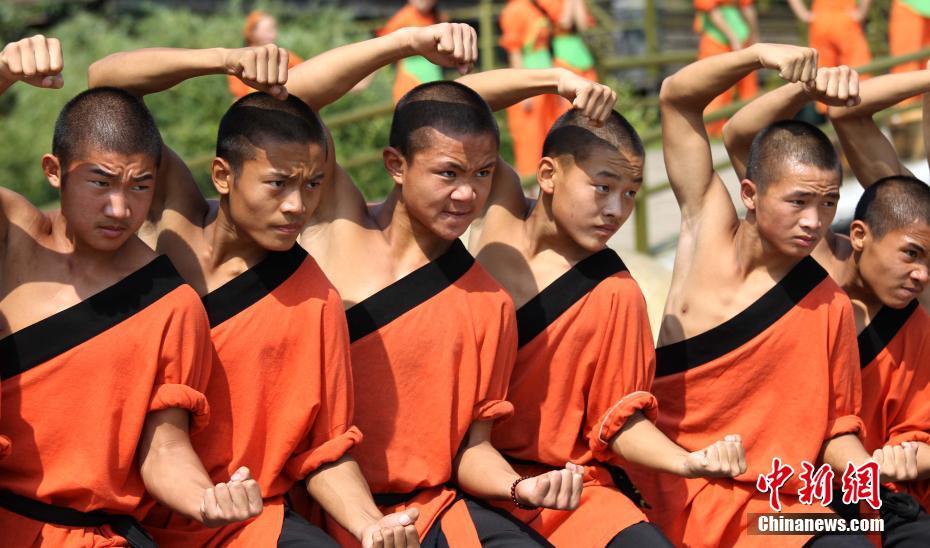 9月29日,河南登封嵩山脚下禅宗少林演武广场,一群少林武僧头顶矿泉水瓶金鸡独立、扎马步,苦练基本功。据了解,每逢国庆长假,都会有大量中外游客涌向少林武术发源地河南登封旅游。王中举摄