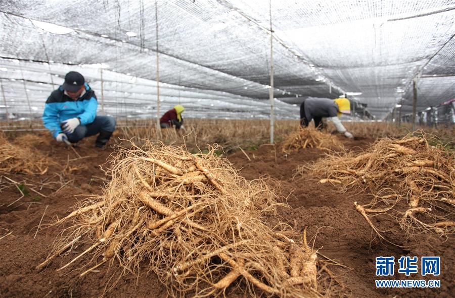 10月23日,山东文登大水泊镇的参农在收获西洋参。眼下正是我国西洋参主产区山东省威海市文登区西洋参收获的季节,当地种植户、合作社忙着收获、加工西洋参,供应各地市场。近年来,文登西洋参种植户、合作社积极与网购和微信平台合作,借助电商快递物流把西洋参鲜参及各类参产品销售到国内外市场,实现参产品增值,参农增收。新华社发(陈宏青摄)