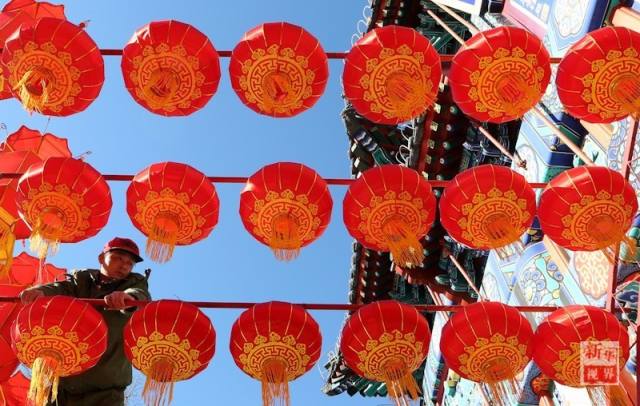 ↑北京怀柔红螺寺景区工作人员在悬挂红灯笼(1月14日摄)。 新华社发(卜向东 摄)