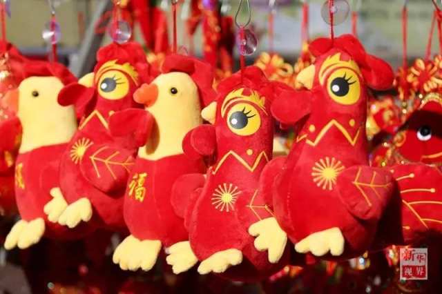 ↑山东枣庄市香港街年货市场的“鸡”饰品(1月14日摄) 新华社发(孙中喆 摄)