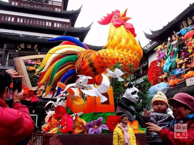 ↑游客在上海市城隍庙景区内和“雄鸡报晓”彩灯合影(1月15日摄)。新华社记者陈飞摄