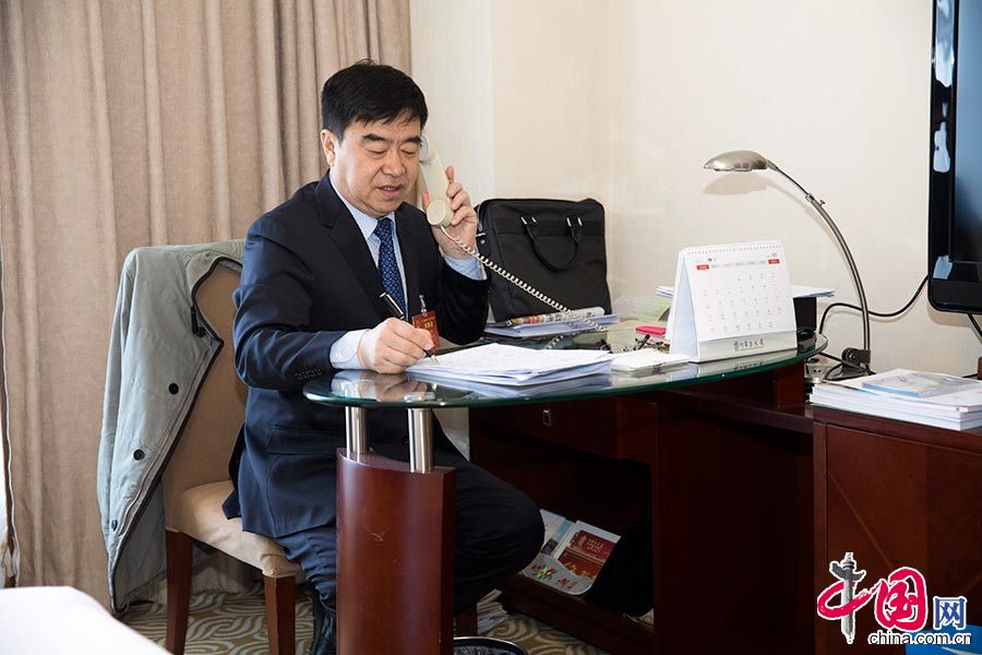 2017年3月8日中午,薛志国在驻地和朱良玉代表电话讨论朱良玉提出的《关于修改完善保安服务管理条例的建议》的细则,他们二人同时农民工代表,也同要是保安行业的代表。中国网董宁摄影