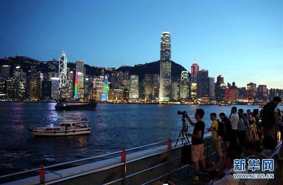 游客在尖沙咀欣赏港岛夜景(2013年7月5日摄)。新华社记者李鹏 摄