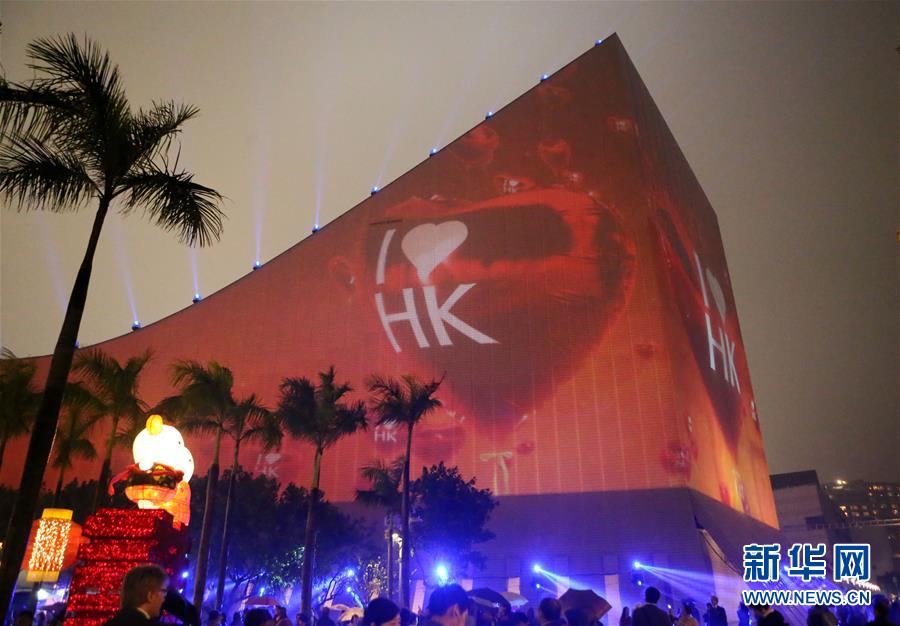 游客在香港尖沙咀文化中心广场观看“闪耀维港”大型3D灯光汇演(2015年3月5日摄)。 新华社记者 李鹏 摄