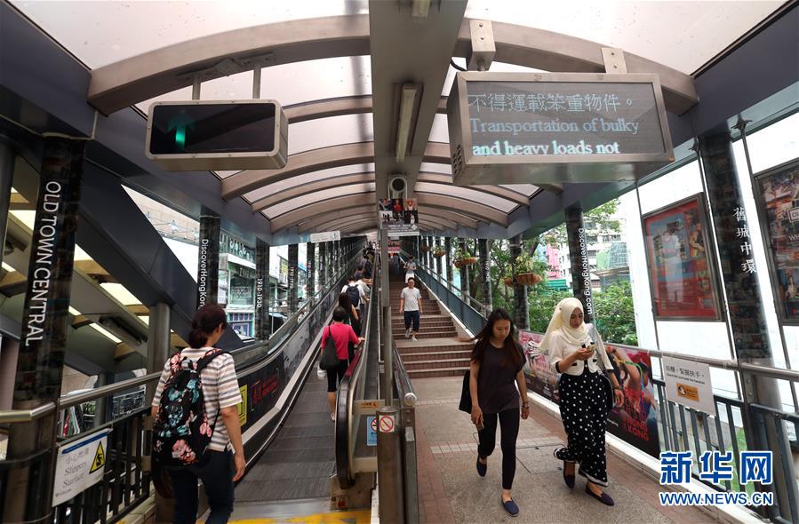 游客在乘坐全长800米的中环至半山自动扶梯(5月30日摄)。 新华社记者 李鹏 摄