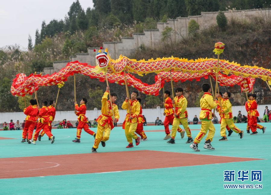 12月25日,在玉屏侗族自治县朱家场镇兴隆小学,学生们表演舞龙。新华社发(胡攀学 摄)