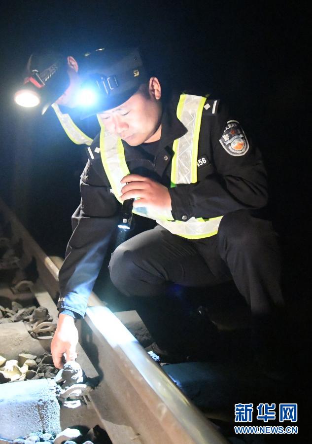 李彬在米花岭隧道内巡逻时检查铁路设施安全情况(2月20日摄)。新华社记者 陆波岸 摄