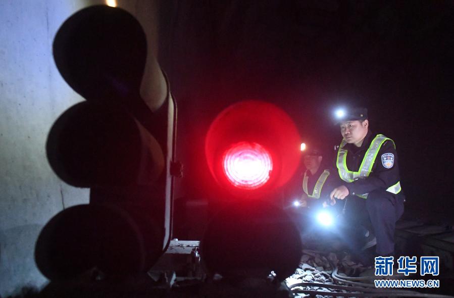 李彬在米花岭隧道内巡逻时检查铁路设施安全情况(2月20日摄)。新华社记者 陆波岸 摄