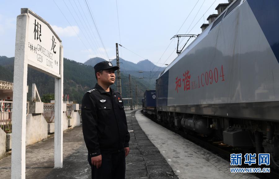 李彬在南昆铁路根龙站执勤(2月20日摄)。新华社记者 陆波岸 摄
