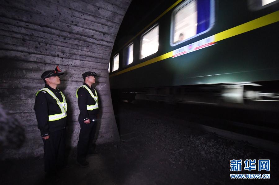 李彬(右)和辅警潘永新在米花岭隧道内巡逻时,躲进避风洞避让驶过的列车(2月20日摄)。新华社记者 陆波岸 摄