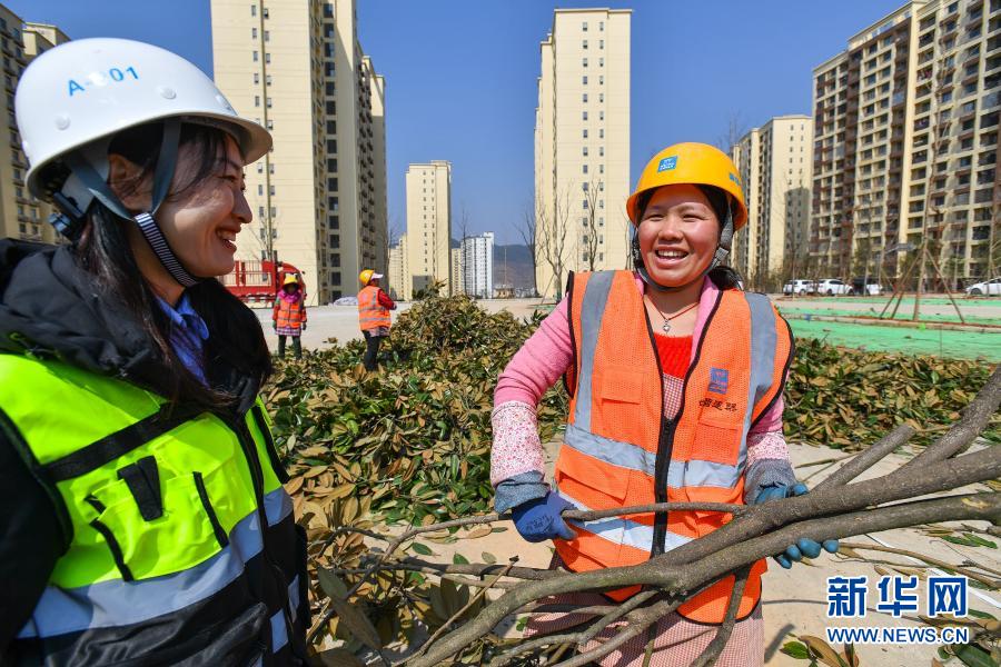 张薇(左)在项目工地上与劳务工刘万洪聊天,问她有没有按时拿到工资(3月5日摄)。从巧家县大山里搬迁下来的刘万洪在家门口就业,每月能有2000多元的收入。