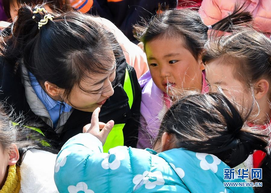张薇和鲁甸易地扶贫搬迁安置区第一幼儿园的小朋友们在一起(3月4日摄)。这个安置区建设有四所幼儿园,能够解决全区所有适龄儿童的入园问题。新华社记者 刘大伟 摄