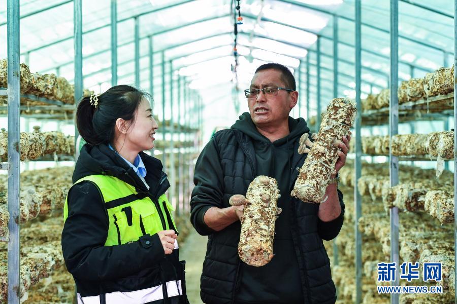 鲁甸易地扶贫搬迁安置区春熙社区党总支书记张福来(右)在卯家湾食用菌种植基地香菇车间向张薇介绍香菇的长势,张福来对口负责这个和广东企业合作的食用菌种植基地(3月4日摄)。新华社记者 刘大伟 摄