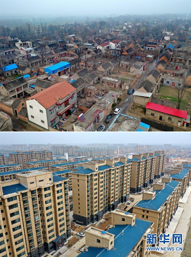 拼版照片:上图:杨明兰旧居所在的封丘县李庄镇朱寨村(无人机照片,3月11日摄);下图:杨明兰搬入的新区(无人机照片,3月12日摄)。