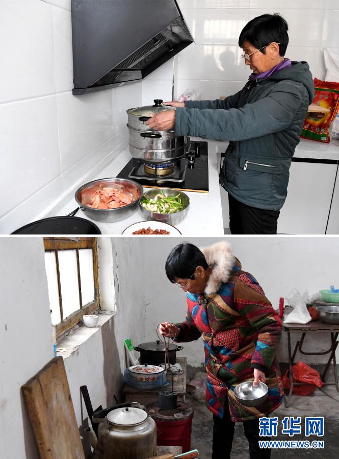 拼版照片:上图:杨明兰在新居里用燃气灶做饭(3月12日摄);下图:杨明兰在老房子里给煤炉添煤(3月11日摄)。