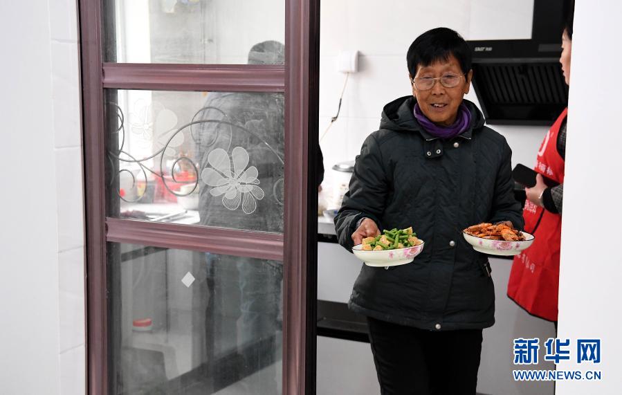 杨明兰在新居内把做好的饭菜端出厨房(3月12日摄)。