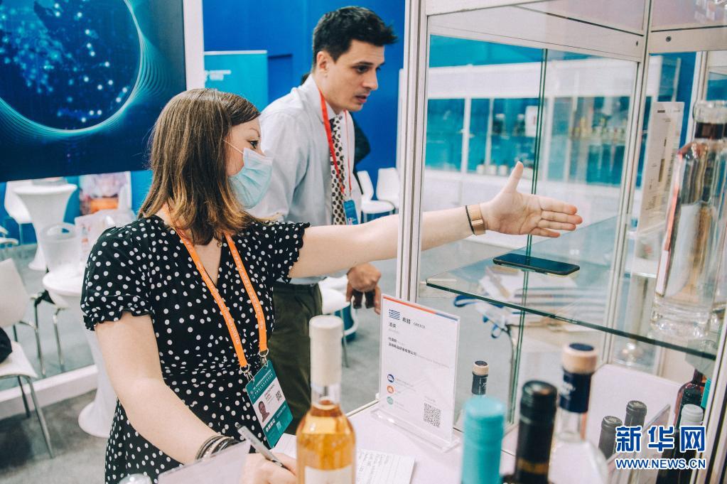 6月9日,埃莱妮(左)在博览会现场的展位上布置展品。
