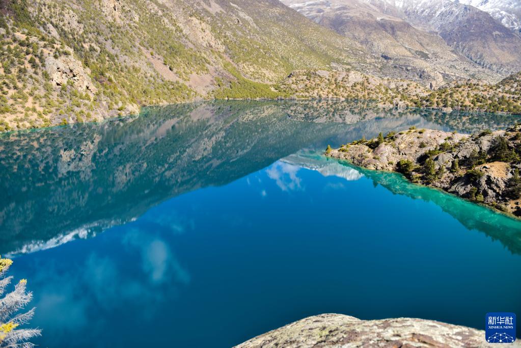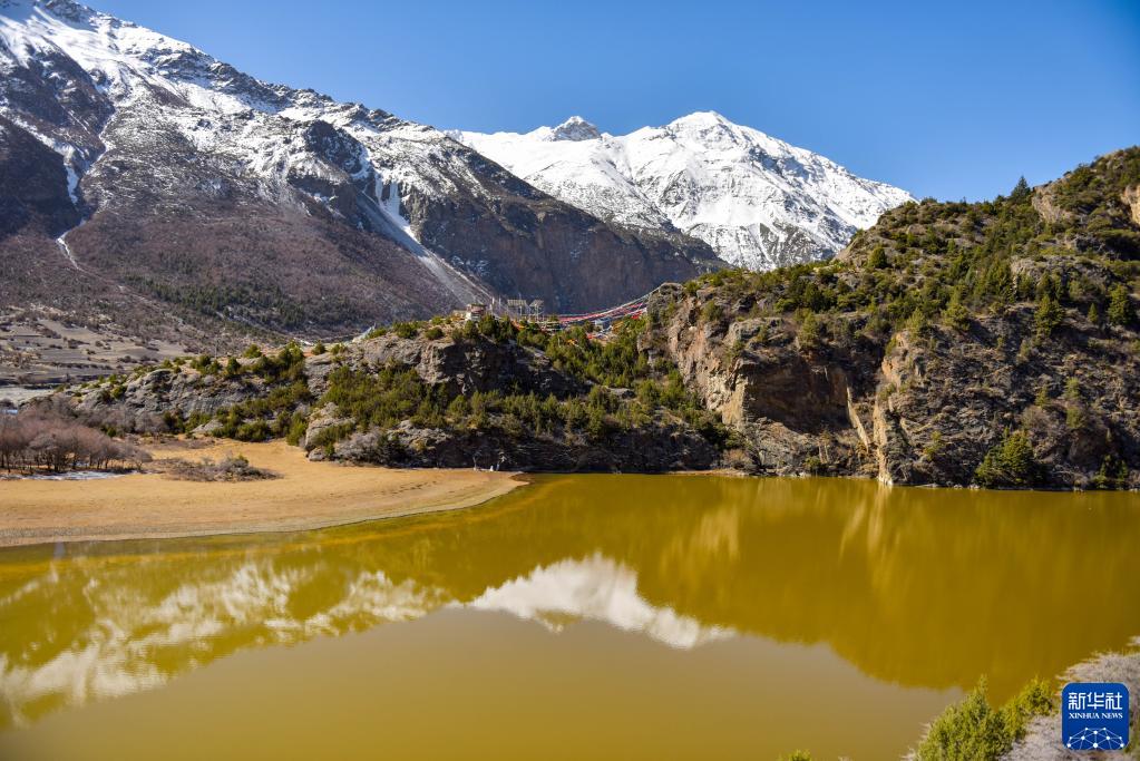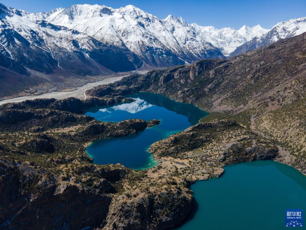 黑湖映射出雪山的倒影(4月2日摄,无人机照片)。