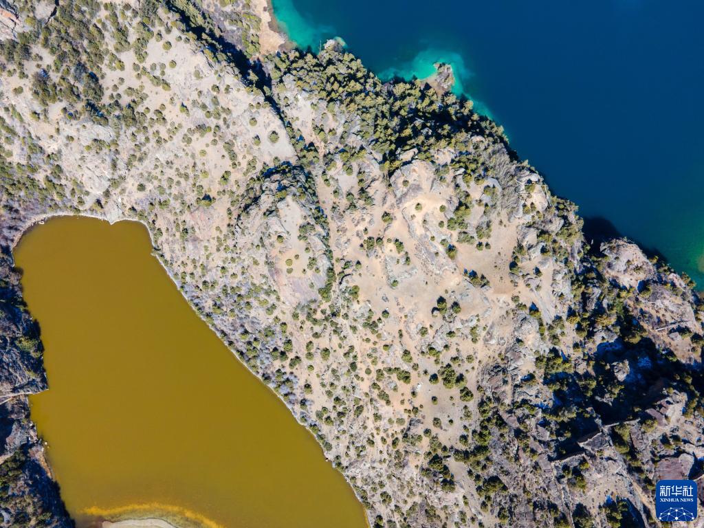 这是“三色湖”中的黄湖和黑湖(4月2日摄,无人机照片)。