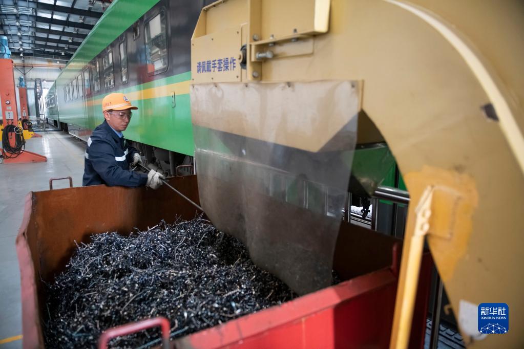 4月26日,吴志祥在整理车轮镟修产生的废料。新华社记者 陈欣波 摄