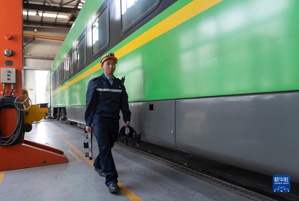 4月26日,吴志祥手提轮径尺准备去测量车轮。新华社记者 陈欣波 摄