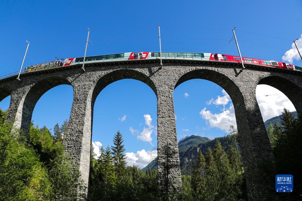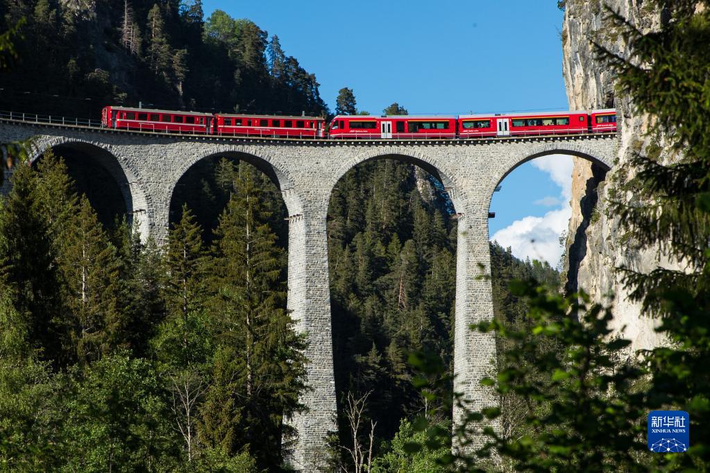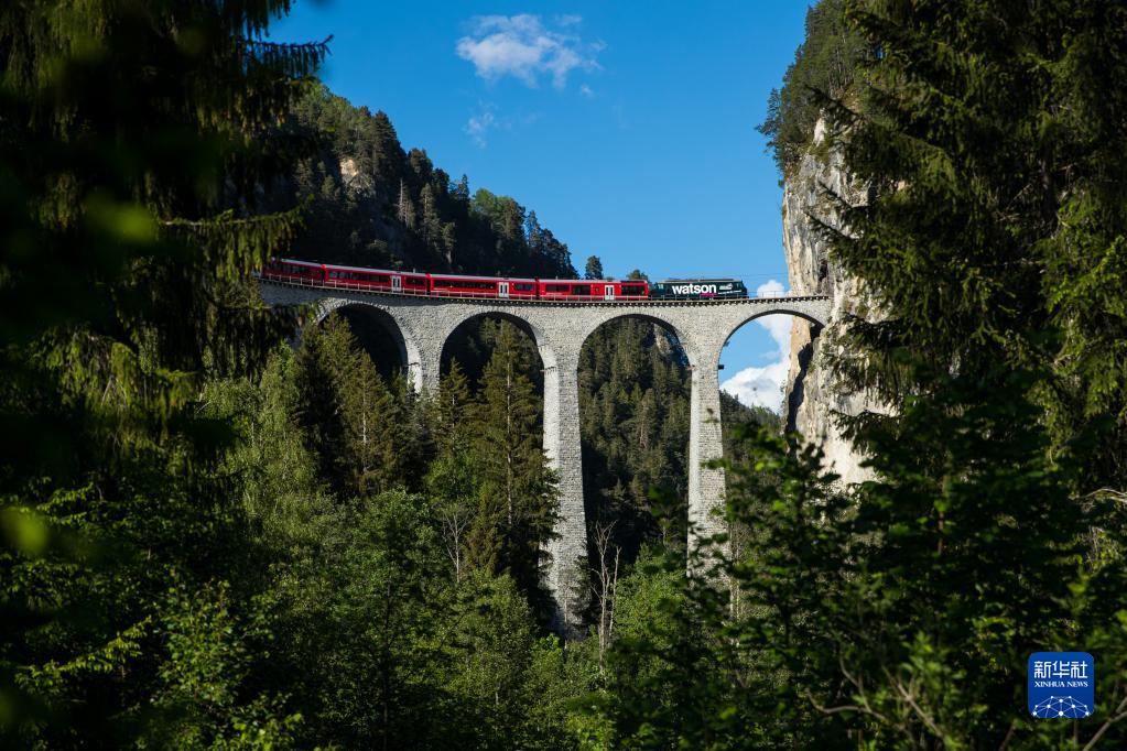 5月26日,一列火车行驶在瑞士阿尔布拉-贝尔尼纳铁路线的高架桥上。新华社记者 郑焕松 摄
