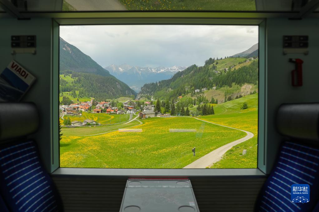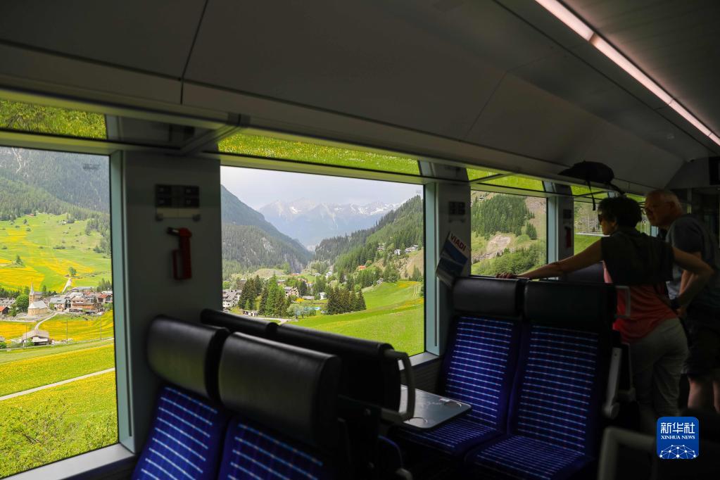 5月22日,乘客在瑞士阿尔布拉-贝尔尼纳铁路线的一列火车上欣赏沿途的风景。新华社记者 郑焕松 摄