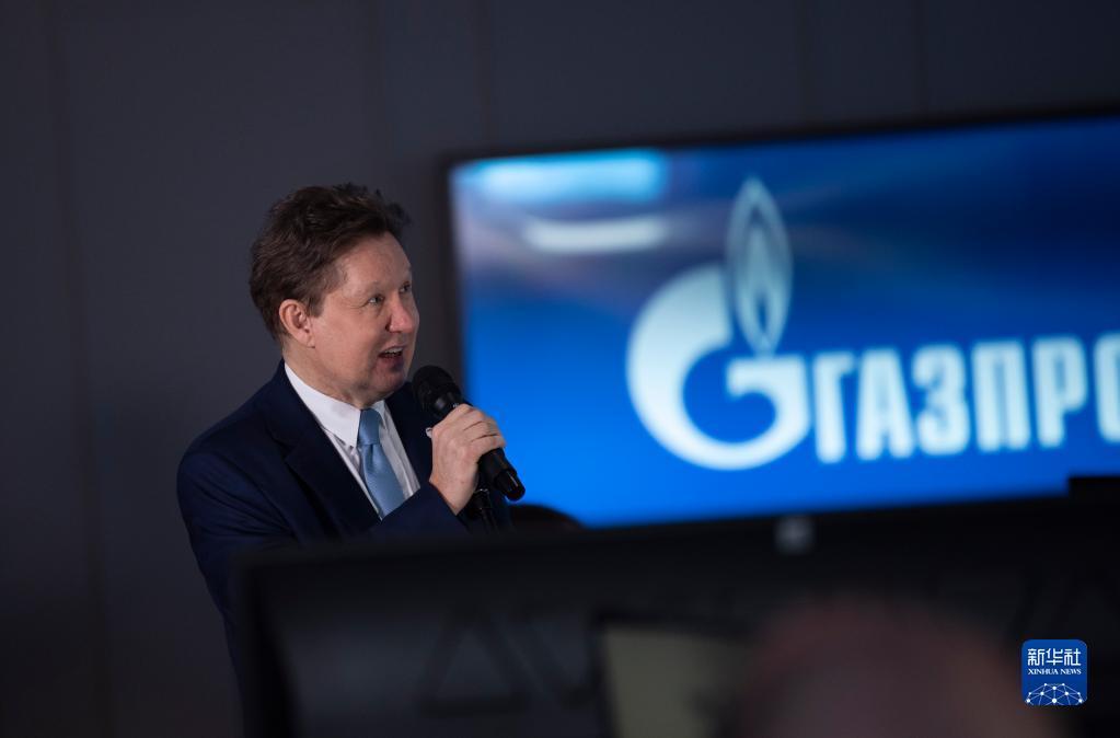 12月21日,在俄罗斯圣彼得堡,俄罗斯天然气工业公司总裁米勒在科维克塔天然气气田和“科维克塔—恰扬达”天然气管道投产通气仪式上与俄罗斯总统普京(未见于画面)和气田现场进行视频连线。