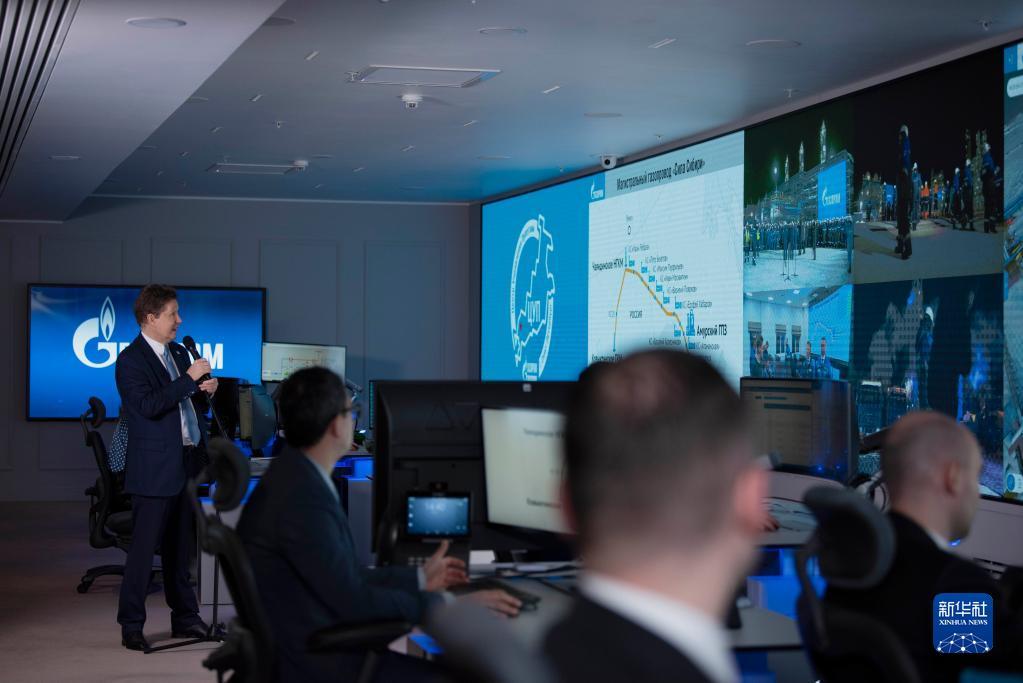 12月21日,在俄罗斯圣彼得堡,俄罗斯天然气工业公司总裁米勒(左一)在科维克塔天然气气田和“科维克塔—恰扬达”天然气管道投产通气仪式上与俄罗斯总统普京(未见于画面)和气田现场进行视频连线。