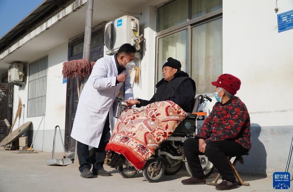 1月10日,在山东省郓城县郭屯镇邵集村,村卫生室的全科医生杨延秋上门为78岁老人杨印武检查身体。