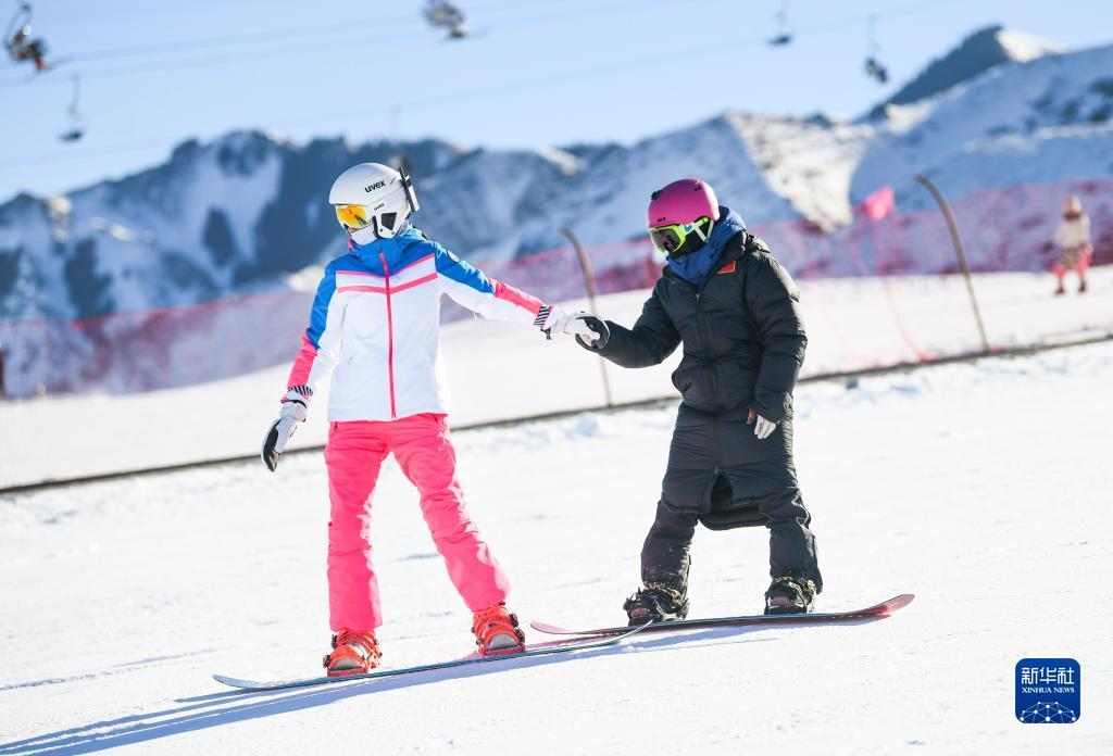 在新疆白云国际滑雪场,许秀娟(右)教学员单板滑雪技巧(1月26日摄)。