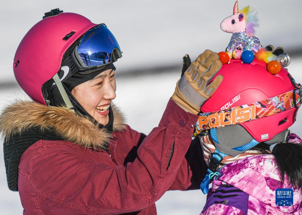 在新疆白云国际滑雪场,许秀娟(左)帮小学员整理头盔(2021年1月27日摄)。