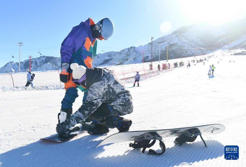 在新疆白云国际滑雪场,把尔斯·木拉提(右)教学员单板滑雪技巧(1月26日摄)。