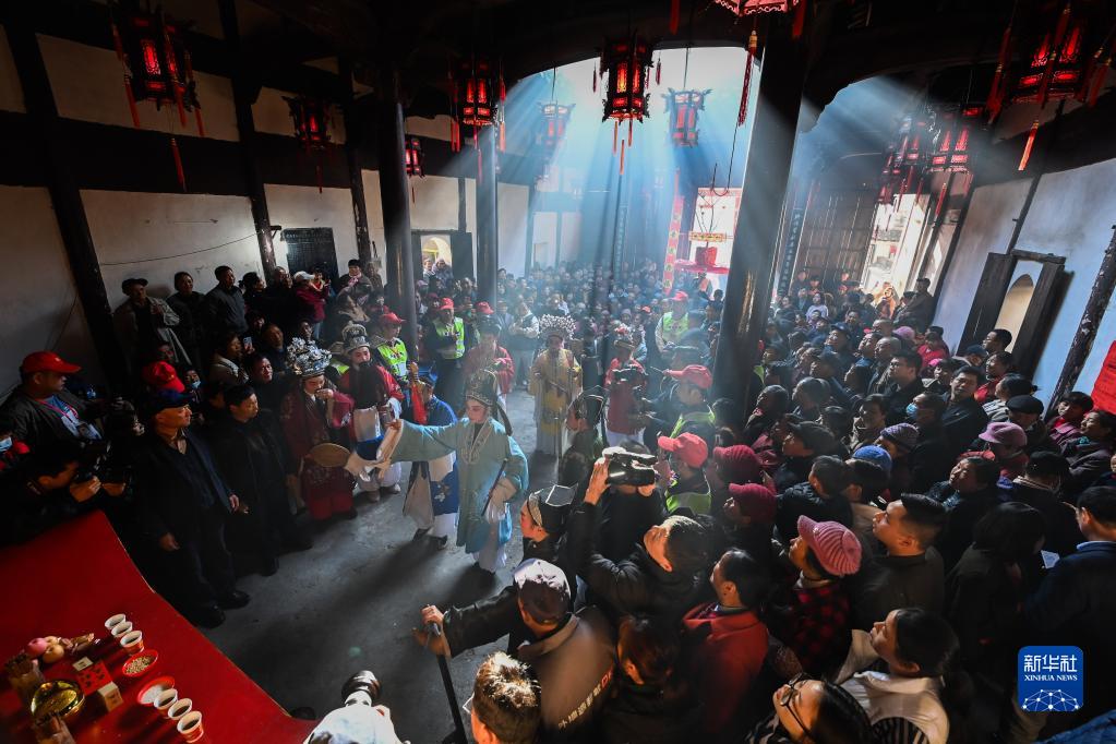 3月10日,在浙江省杭州市淳安县屏门乡屏前村的老祠堂内,人们在观看表演。