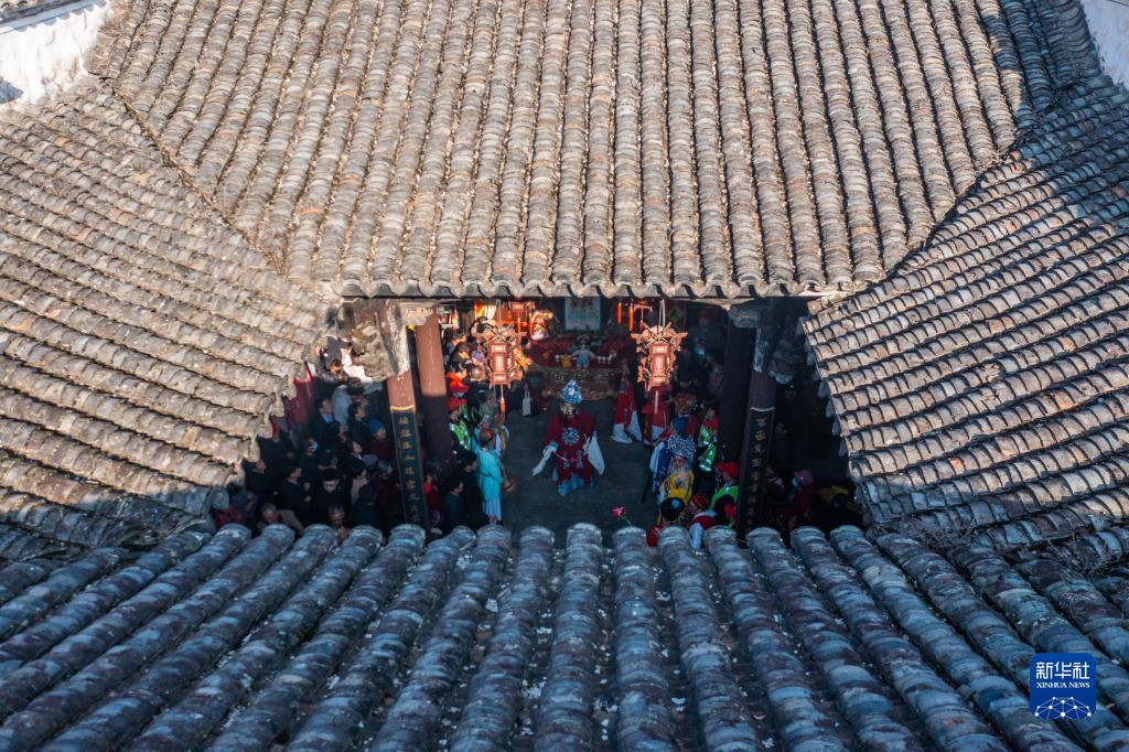 3月10日,在浙江省杭州市淳安县屏门乡屏前村的老祠堂内,人们在观看表演(无人机照片)。