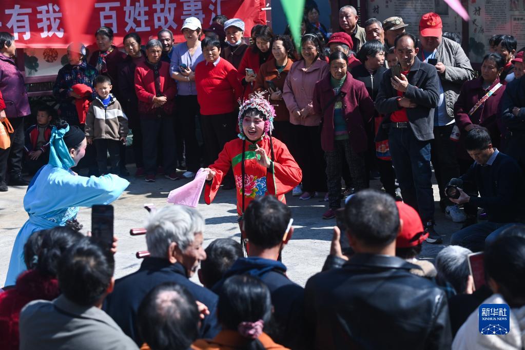 3月10日,在浙江省杭州市淳安县屏门乡屏前村的传统庙会上,人们在观看屏门睦剧表演。